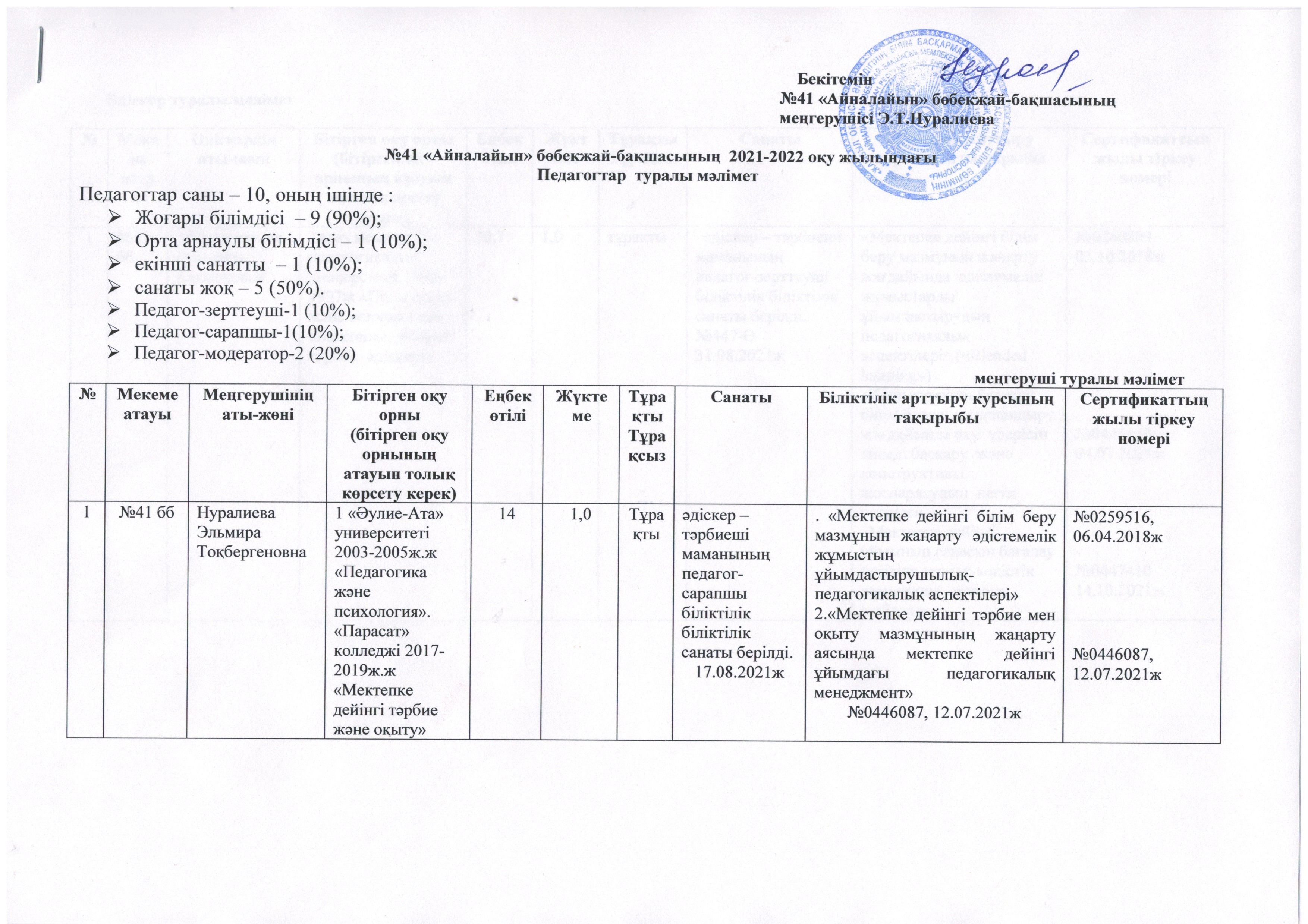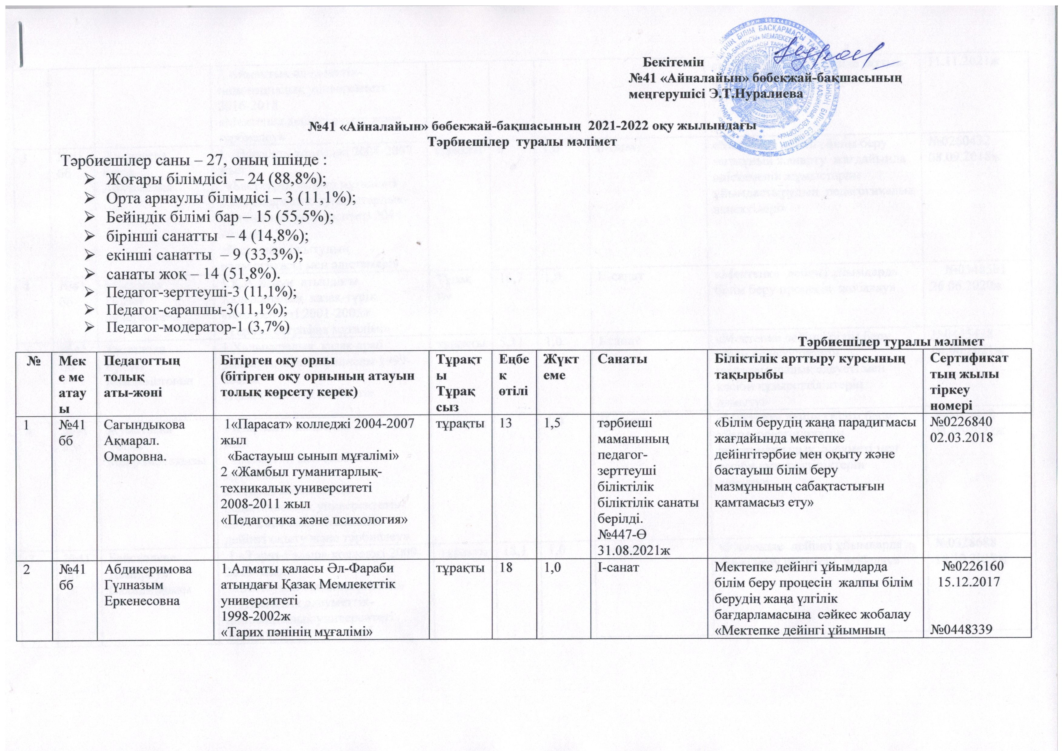 Педагогтар туралы мәлімет » №41 Айналайын бөбекжай-бақшасы