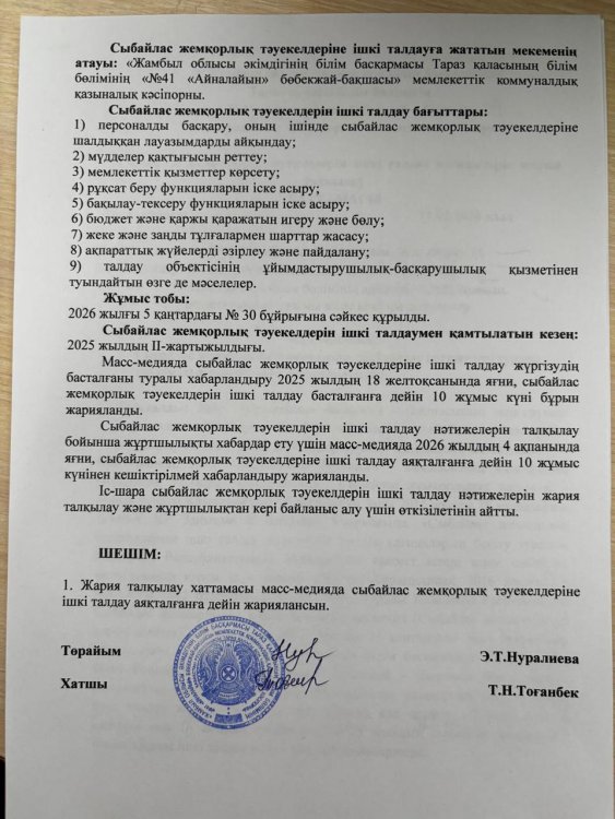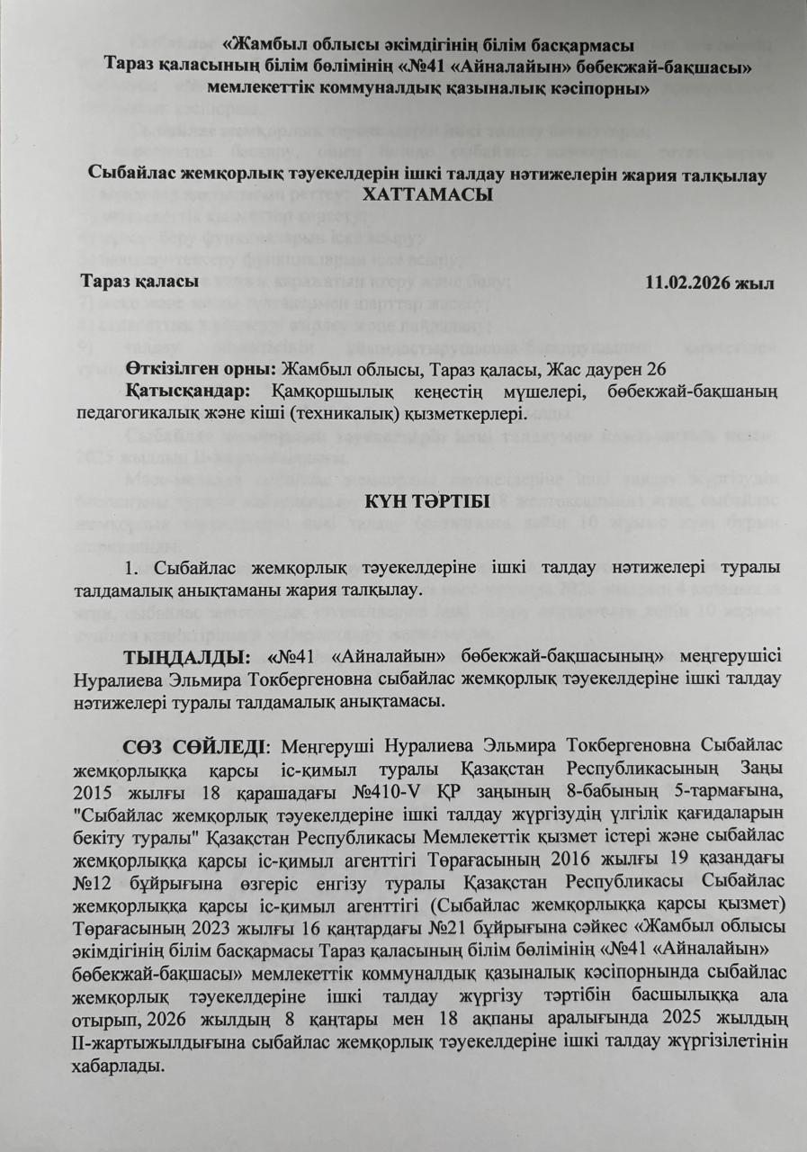 11 февраль 2026 0 1 2 3 4 5 Сыбайлас жемқорлық тәуекелдерін ішкі талдау нәтижелерін жария талқылау ХАТТАМАСЫ Осы беттің QR-коды:QR-код этой страницы: