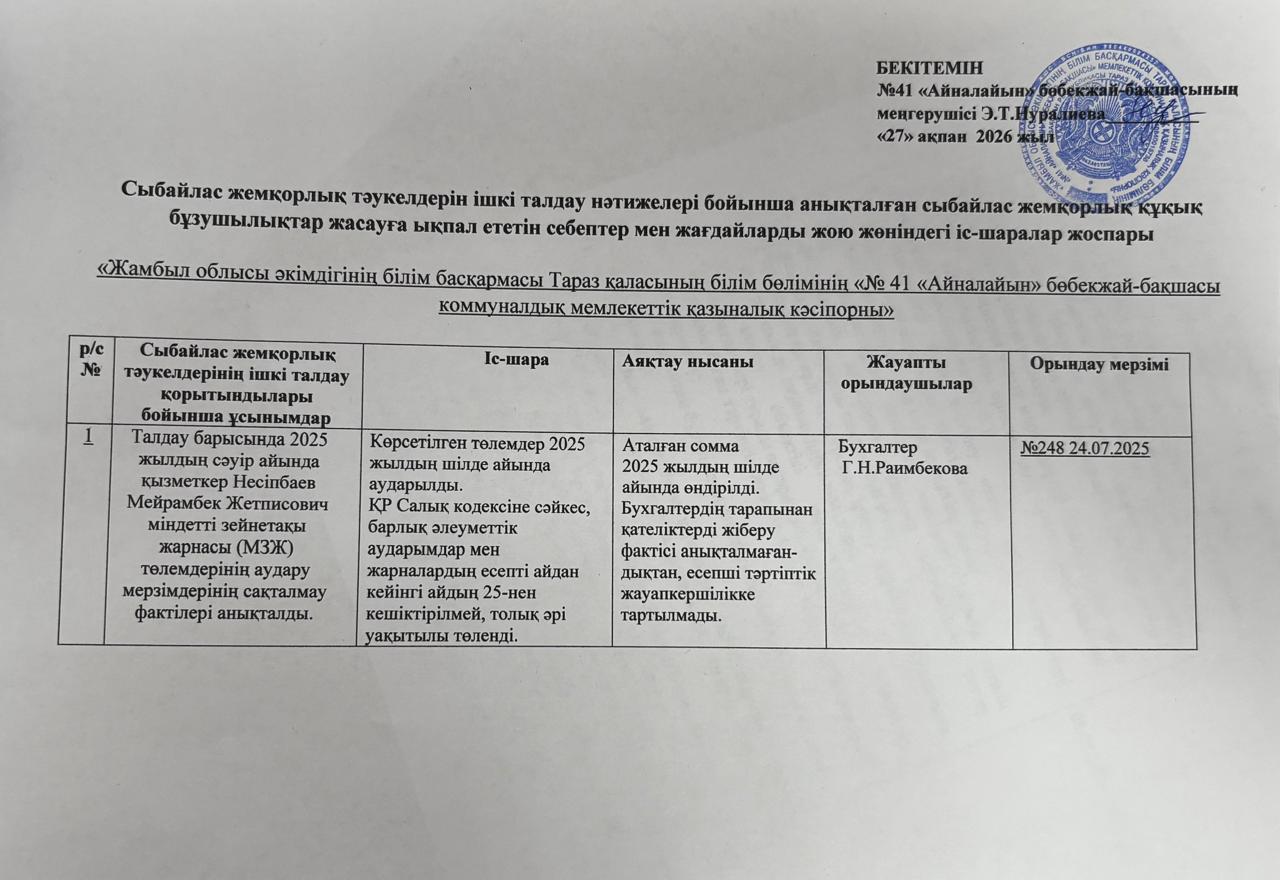 Сыбайлас жемқорлық тәуекелдерін ішкі талдау нәтижелері бойынша анықталған сыбайлас жемқорлық құқық бұзушылықтар жасауға ықпал ететін себептер мен жағдайларды жою жөніндегі іс-шаралар жоспары » №41 Айналайын бөбекжай-бақшасы